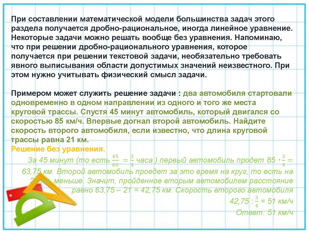 При составлении математической модели большинства задач этогораздела получается дробно-рациональное, иногда линейное уравнение.