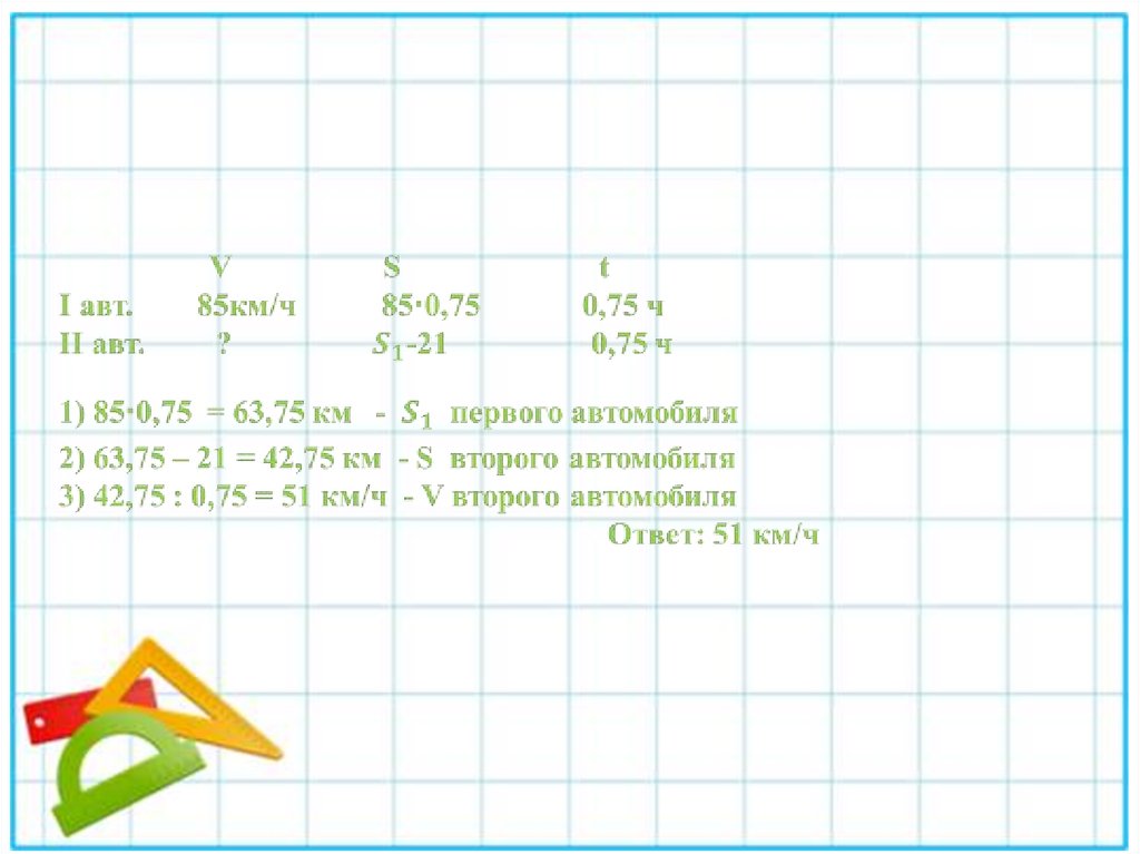 равно 63,75 – 21 = 42,75 км. Скорость второго автомобиля