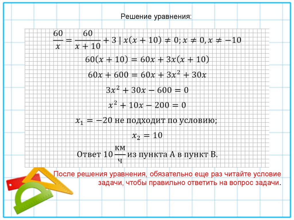9. За неизвестную величину (Х) взяли то, что нужно найти по задачи. Расстояние в 60 км записываем в обе строчки, поскольку