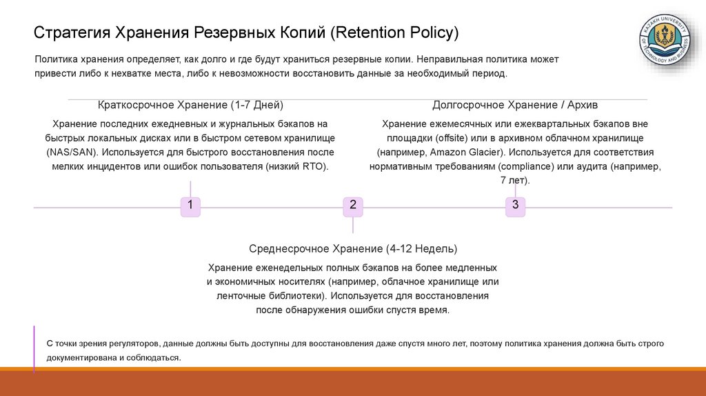С точки зрения регуляторов, данные должны быть доступны для восстановления даже спустя много лет, поэтому политика хранения должна быть строго