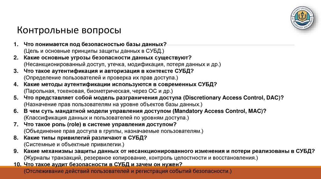 Контрольные вопросы1. Что понимается под безопасностью базы данных?