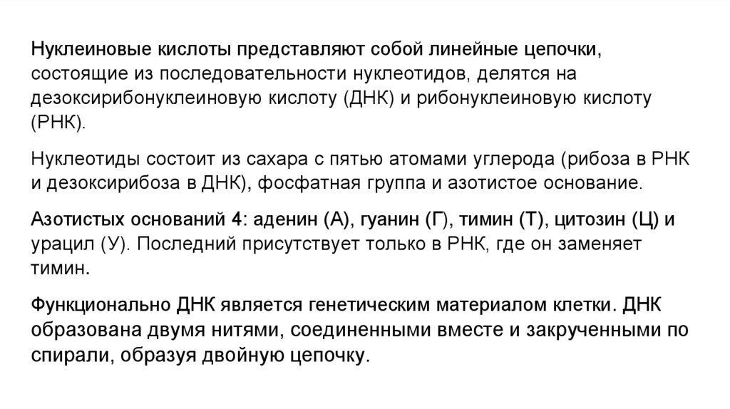 Нуклеиновые кислоты представляют собой линейные цепочки,состоящие из последовательности нуклеотидов, делятся на