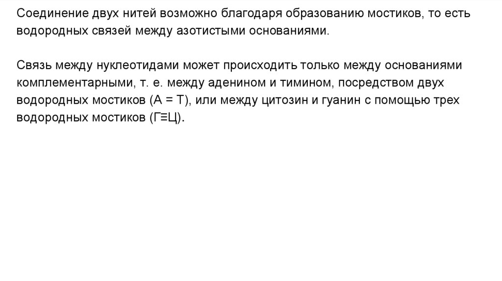 Соединение двух нитей возможно благодаря образованию мостиков, то естьводородных связей между азотистыми основаниями.