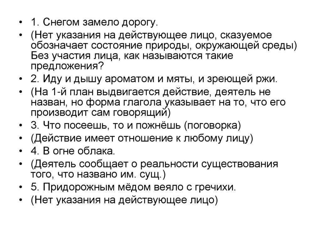 • 1. Снегом замело дорогу.• (Нет указания на действующее лицо, сказуемое