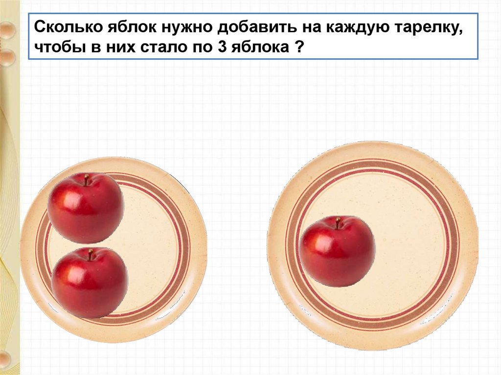 Сколько яблок нужно добавить на каждую тарелку,чтобы в них стало по 3 яблока ?