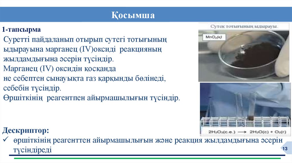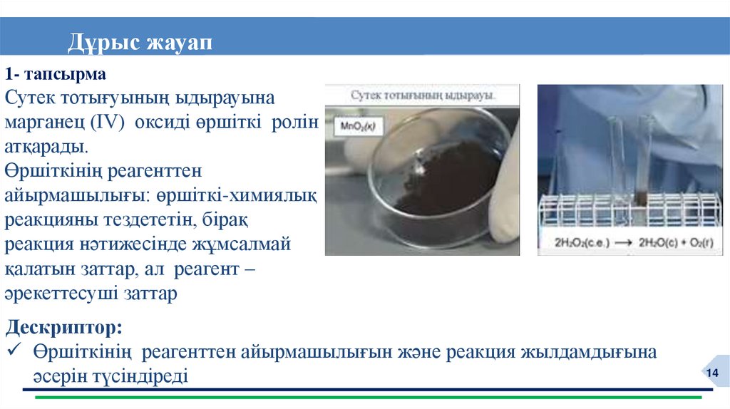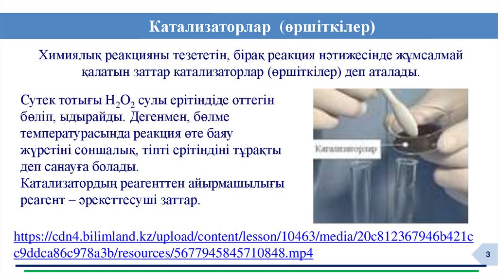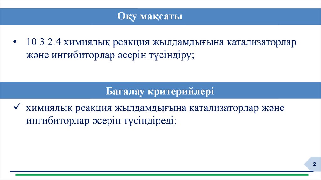 Оқу мақсаты• 10.3.2.4 химиялық реакция жылдамдығына катализаторлар