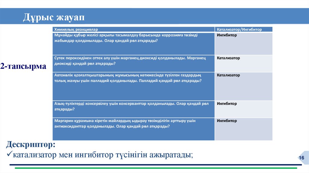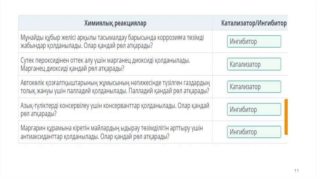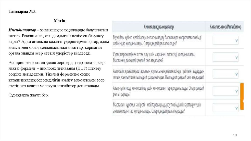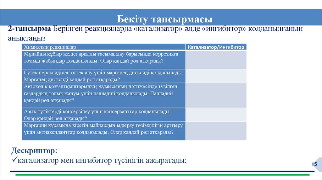 Бекіту тапсырмасы2-тапсырма Берілген реакцияларда «катализатор» әлде «ингибитор» қолданылғанын