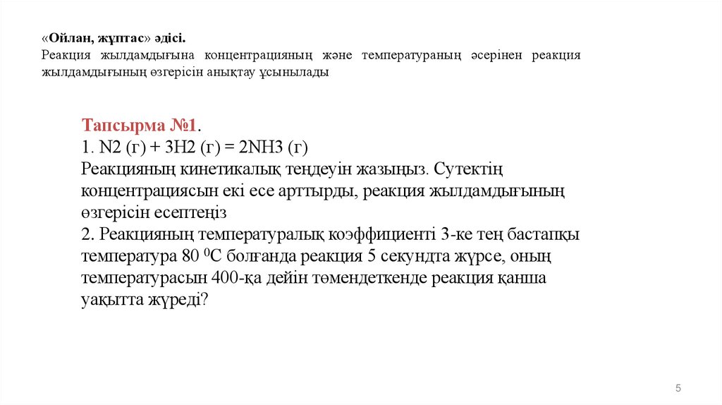«Ойлан, жұптас» әдісі.Реакция жылдамдығына концентрацияның және температураның әсерінен реакция