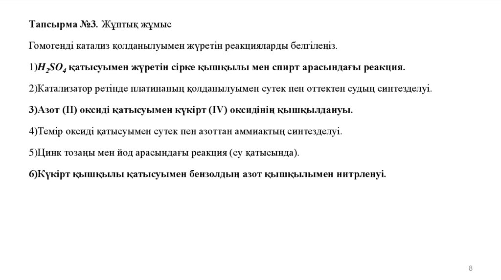 Тапсырма №3. Жұптық жұмысГомогенді катализ қолданылуымен жүретін реакцияларды белгілеңіз.