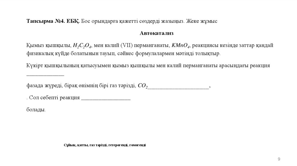Тапсырма №4. ЕБҚ. Бос орындарға қажетті сөздерді жазыңыз. Жеке жұмысАвтокатализ