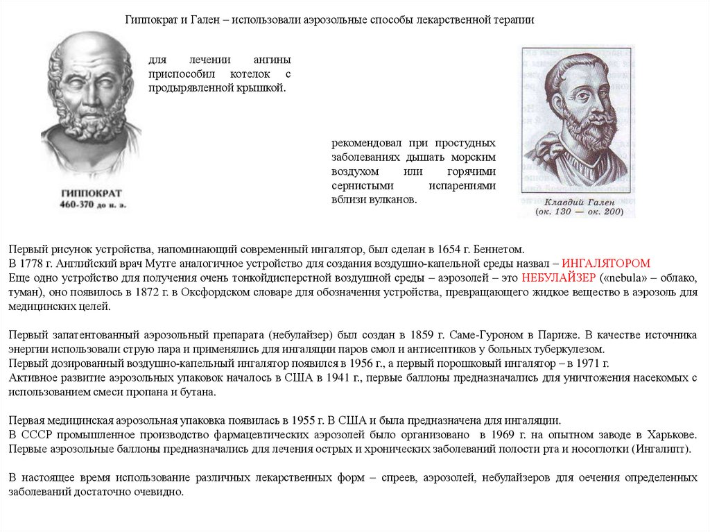 Гиппократ и Гален – использовали аэрозольные способы лекарственной терапиидля
