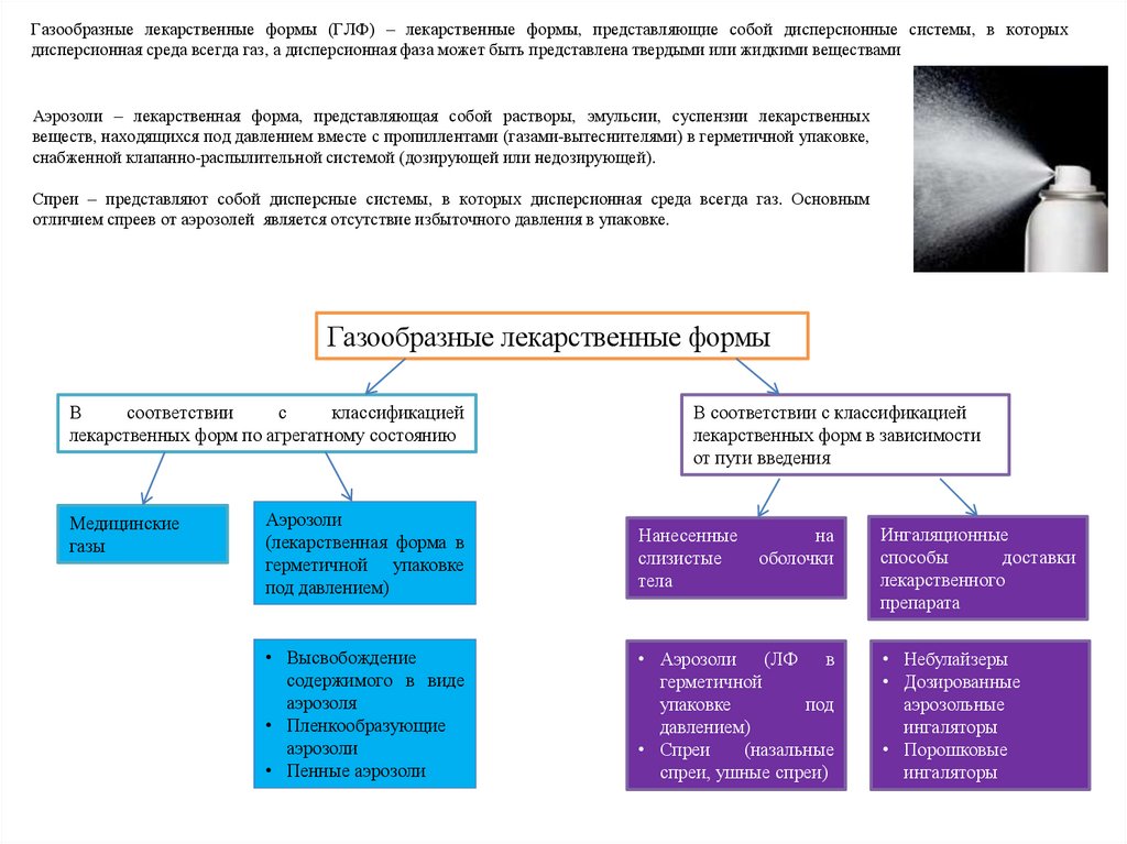 Газообразные лекарственные формы (ГЛФ) – лекарственные формы, представляющие собой дисперсионные системы, в которыхдисперсионная среда всегда газ, а дисперсионная фаза может быть представлена твердыми или жидкими веществами