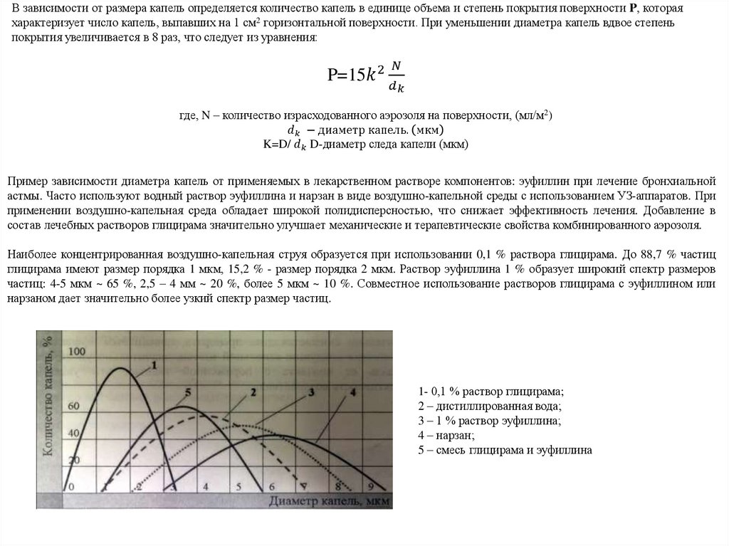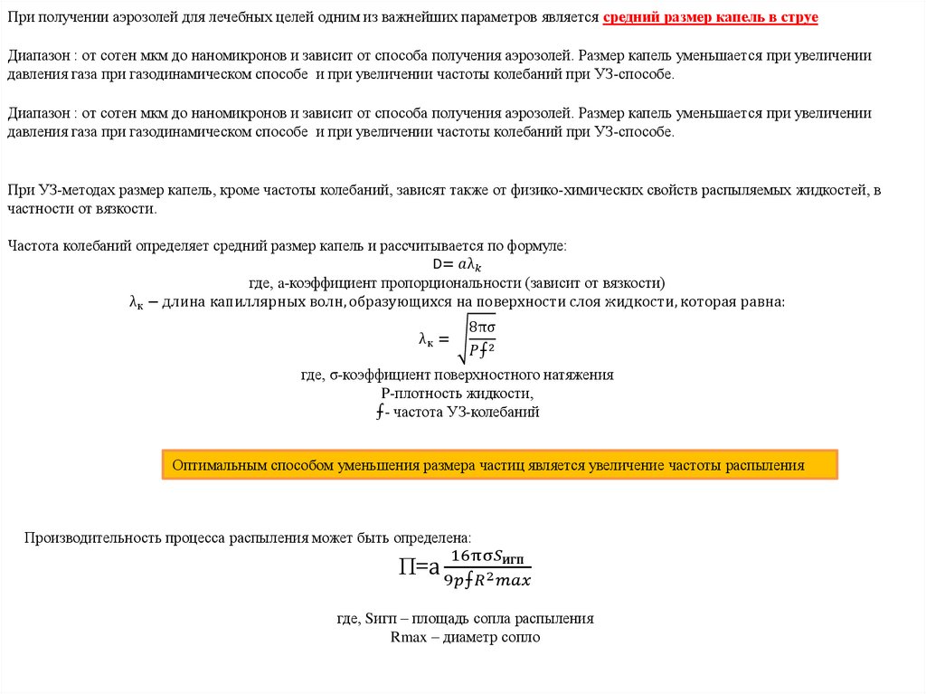 При получении аэрозолей для лечебных целей одним из важнейших параметров является средний размер капель в струеДиапазон : от сотен мкм до наномикронов и зависит от способа получения аэрозолей. Размер капель уменьшается при увеличении