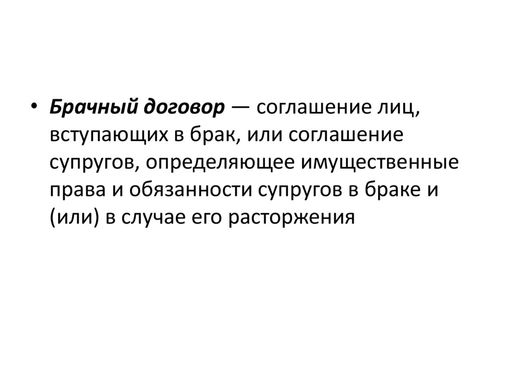• Брачный договор — соглашение лиц,вступающих в брак, или соглашение