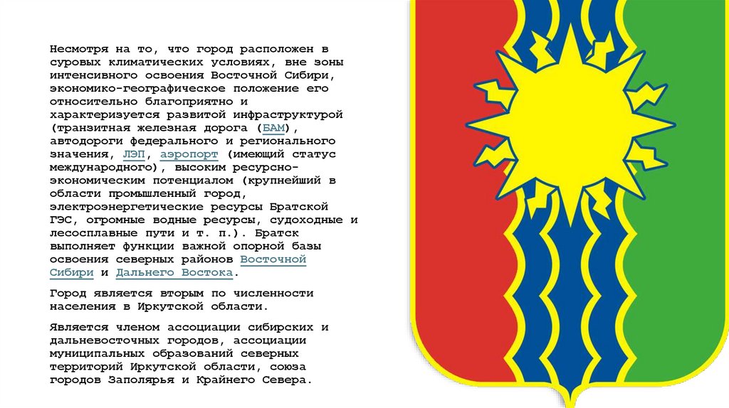 лесосплавные пути и т. п.). Братск выполняет функции важной опорной базы освоения