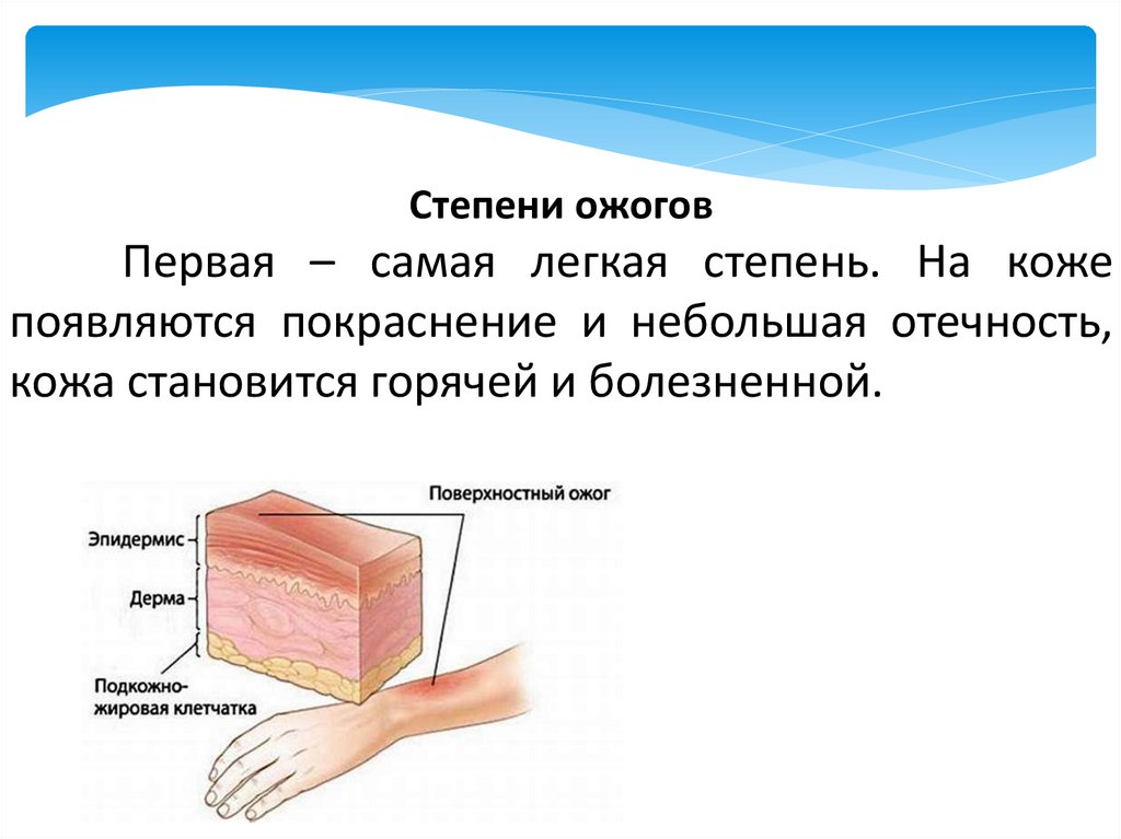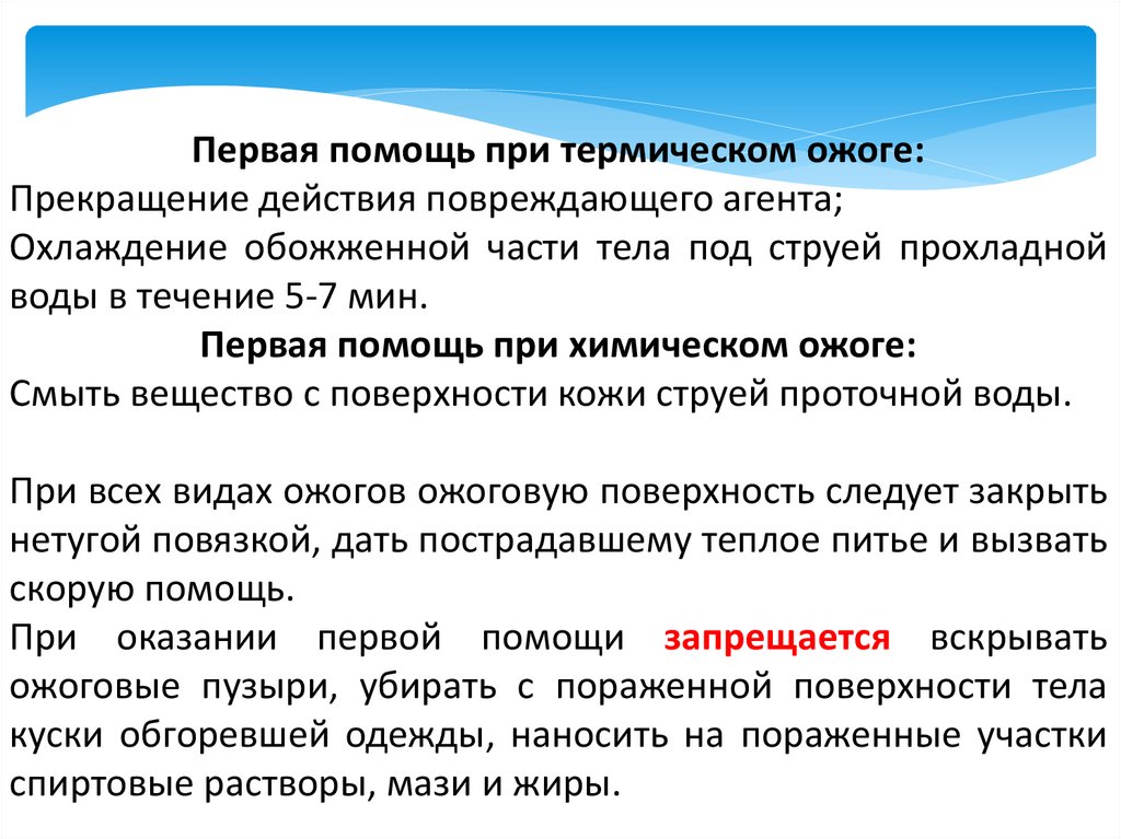 Первая помощь при термическом ожоге:Прекращение действия повреждающего агента;