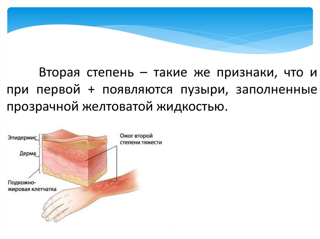 Вторая степень – такие же признаки, что ипри первой + появляются пузыри, заполненные