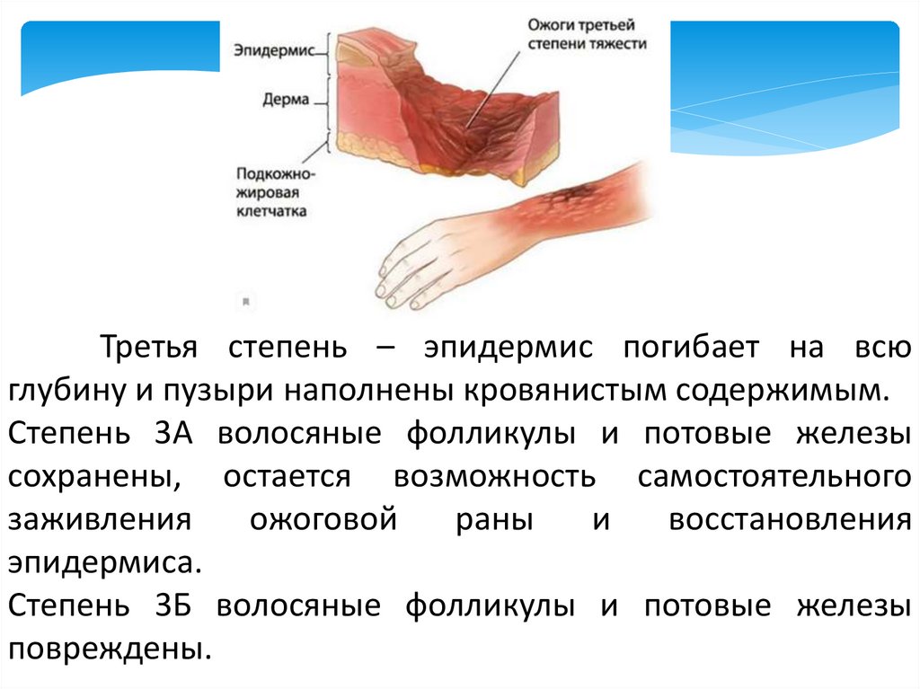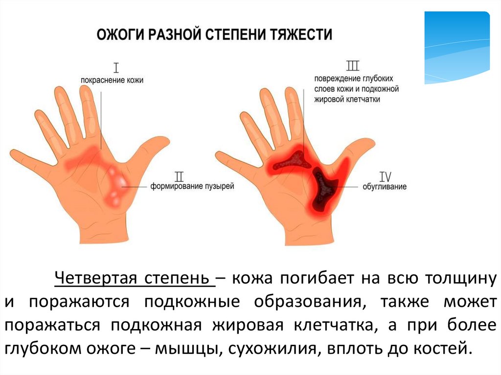 глубоком ожоге – мышцы, сухожилия, вплоть до костей.