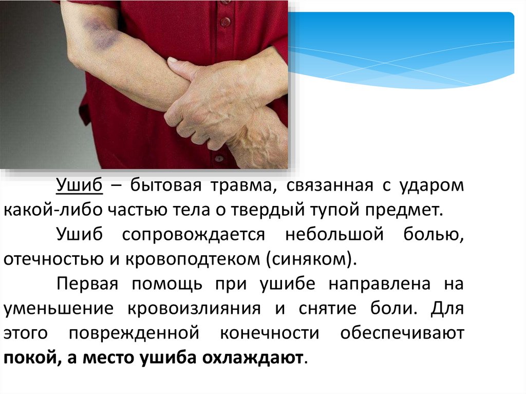 Ушиб – бытовая травма, связанная с ударомкакой-либо частью тела о твердый тупой предмет.