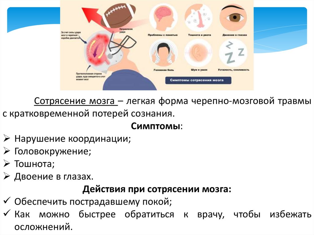 Сотрясение мозга – легкая форма черепно-мозговой травмыс кратковременной потерей сознания.