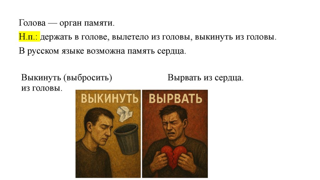 Голова — орган памяти.Н.п.: держать в голове, вылетело из головы, выкинуть из головы.