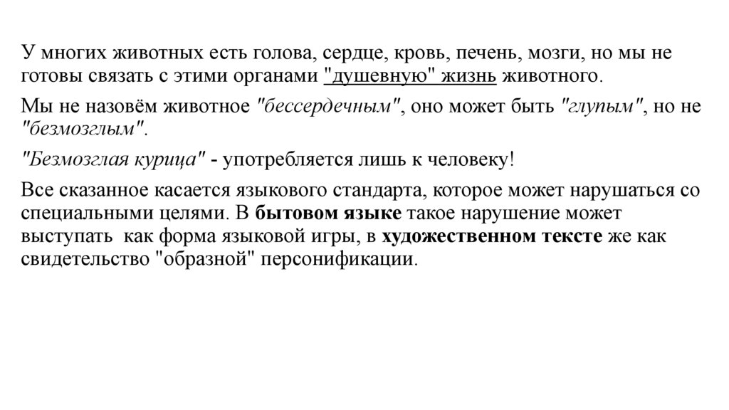 У многих животных есть голова, сердце, кровь, печень, мозги, но мы неготовы связать с этими органами "душевную" жизнь животного.