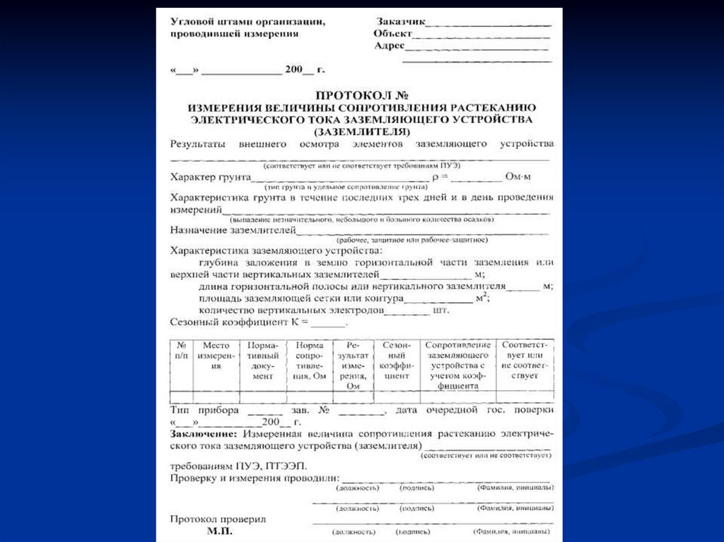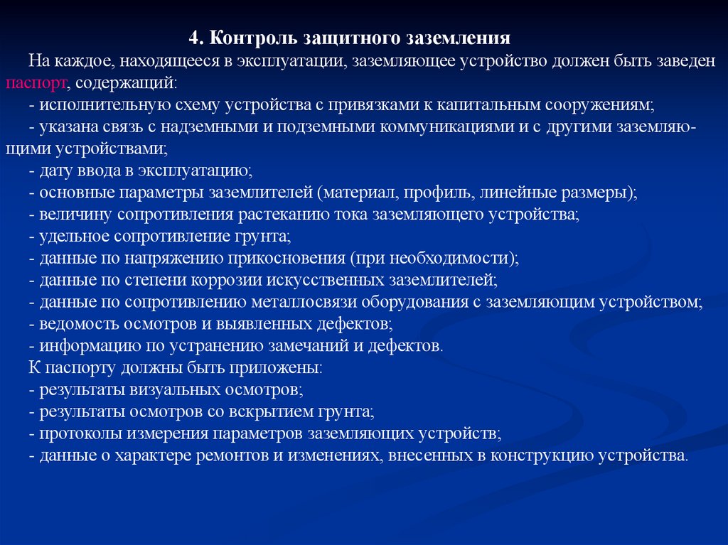 4. Контроль защитного заземленияНа каждое, находящееся в эксплуатации, заземляющее устройство должен быть заведен