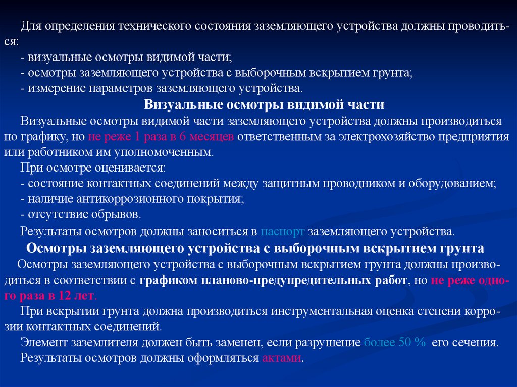 Для определения технического состояния заземляющего устройства должны проводиться:- визуальные осмотры видимой части;