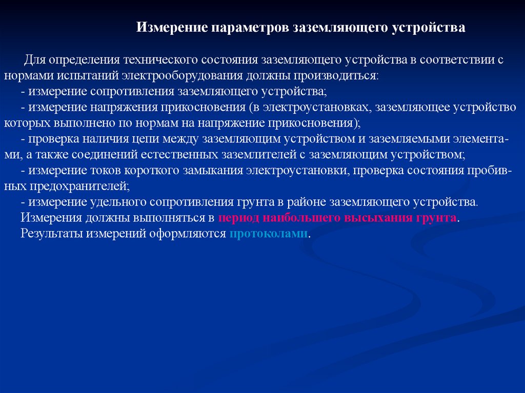 Измерение параметров заземляющего устройстваДля определения технического состояния заземляющего устройства в соответствии с