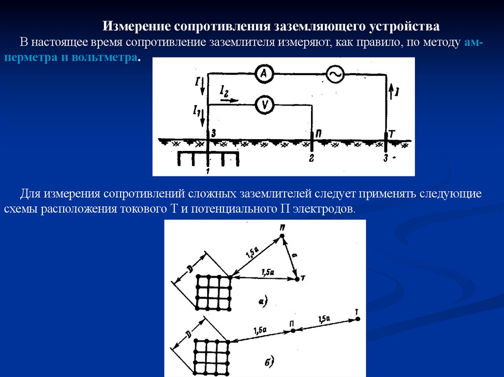 Для измерения сопротивлений сложных заземлителей следует применять следующие