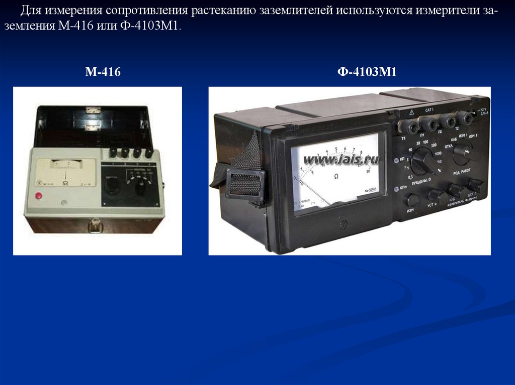 Для измерения сопротивления растеканию заземлителей используются измерители заземления М-416 или Ф-4103М1.М-416