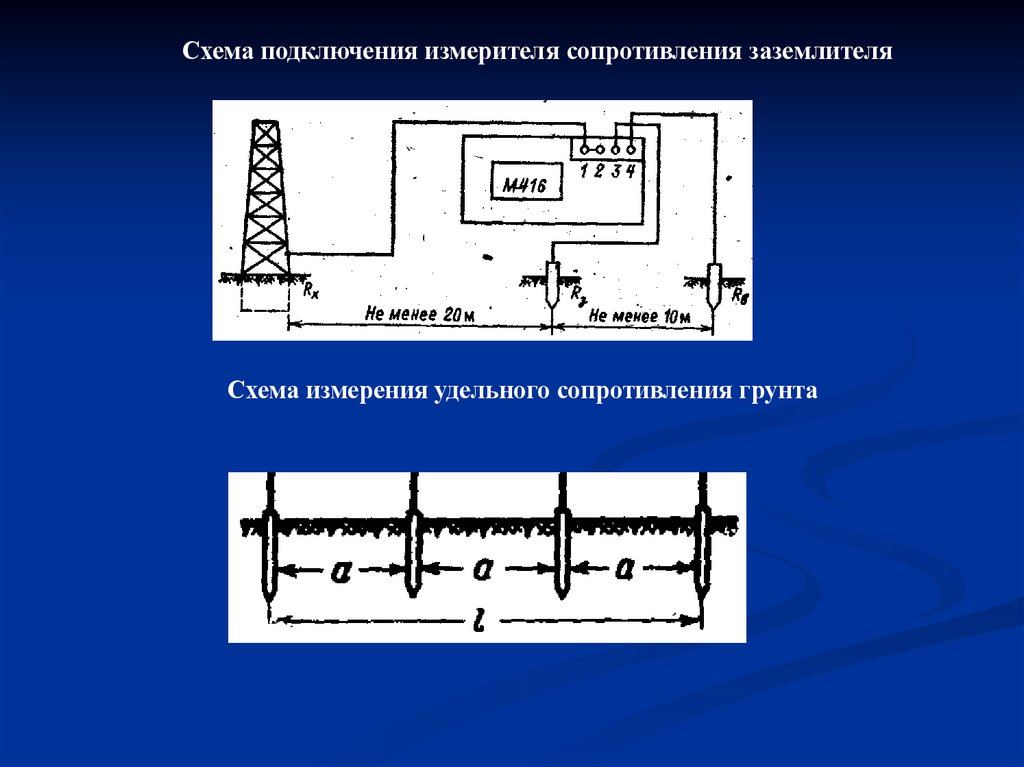 Схема подключения измерителя сопротивления заземлителяСхема измерения удельного сопротивления грунта