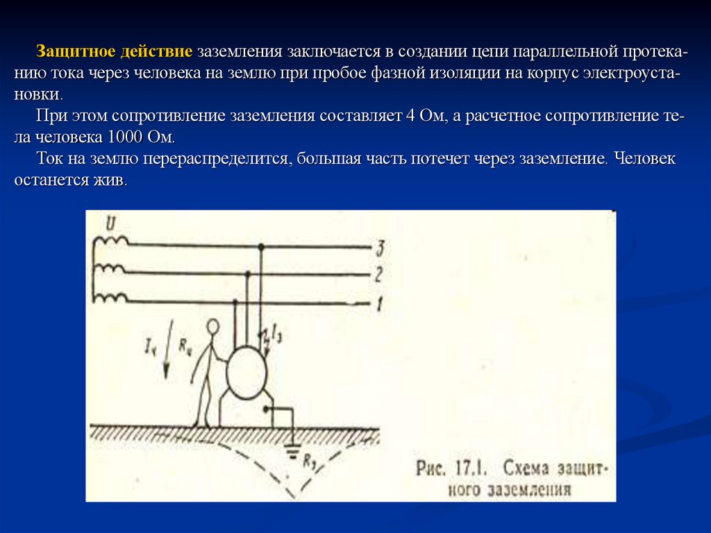 Защитное действие заземления заключается в создании цепи параллельной протеканию тока через человека на землю при пробое фазной изоляции на корпус электроустановки.При этом сопротивление заземления составляет 4 Ом, а расчетное сопротивление тела человека 1000 Ом.