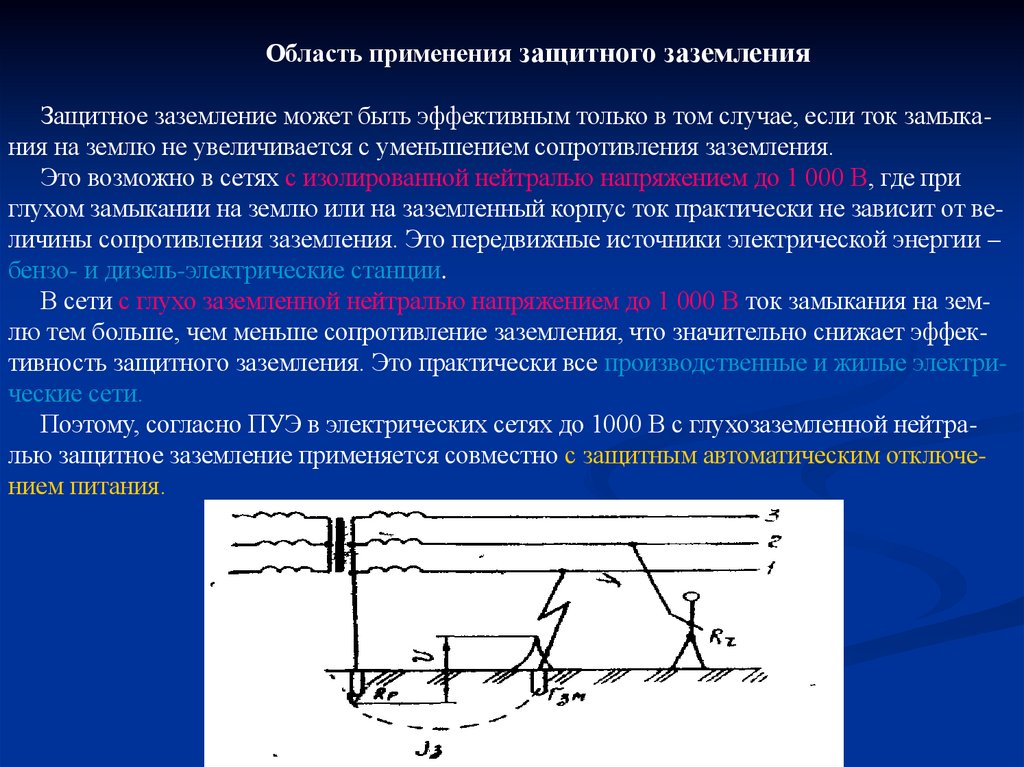 В сети с глухо заземленной нейтралью напряжением до 1 000 В ток замыкания на землю тем больше, чем меньше сопротивление заземления, что значительно снижает эффективность защитного заземления. Это практически все производственные и жилые электрические сети.