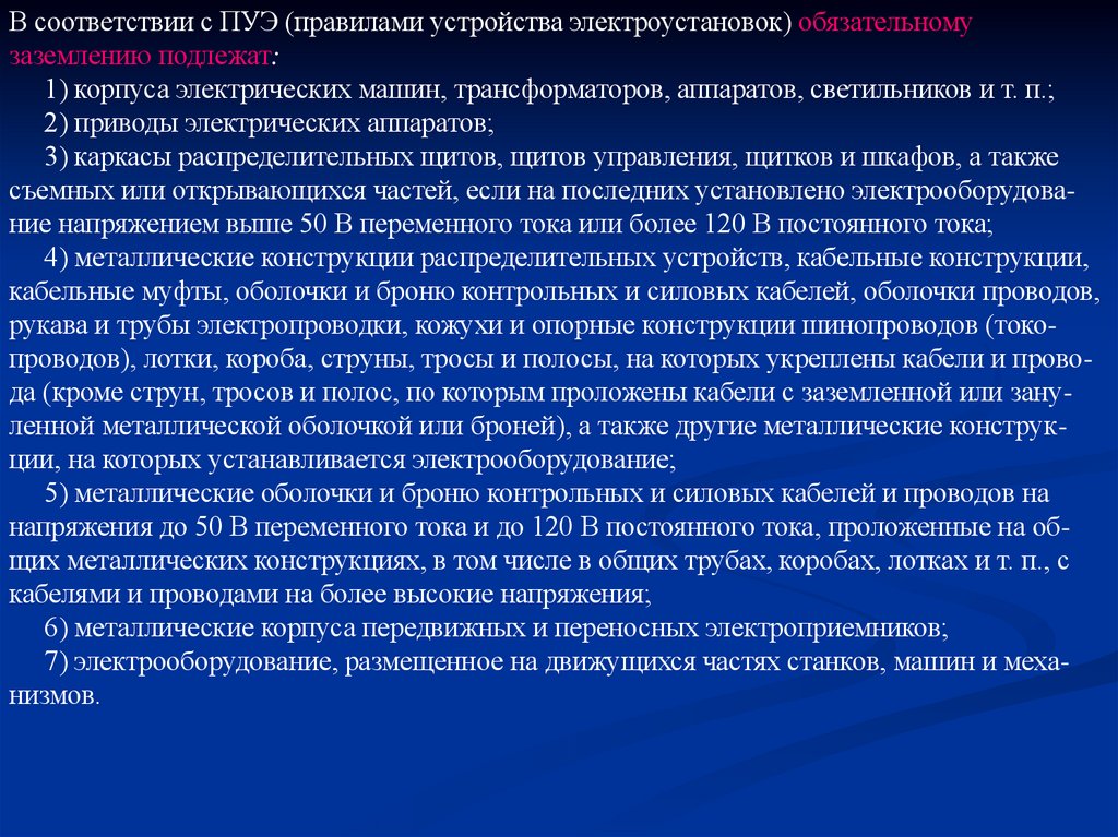 В соответствии с ПУЭ (правилами устройства электроустановок) обязательномузаземлению подлежат: