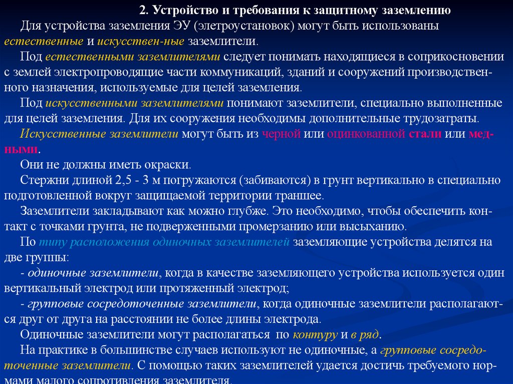 2. Устройство и требования к защитному заземлениюДля устройства заземления ЭУ (элетроустановок) могут быть использованы