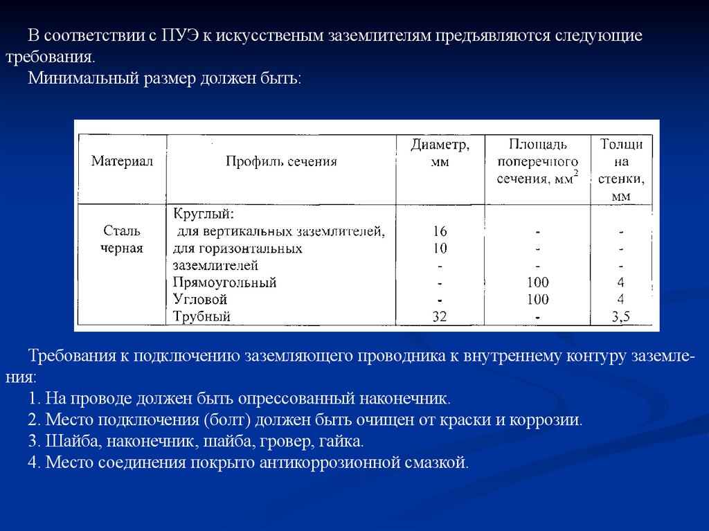 В соответствии с ПУЭ к искусственым заземлителям предъявляются следующиетребования.