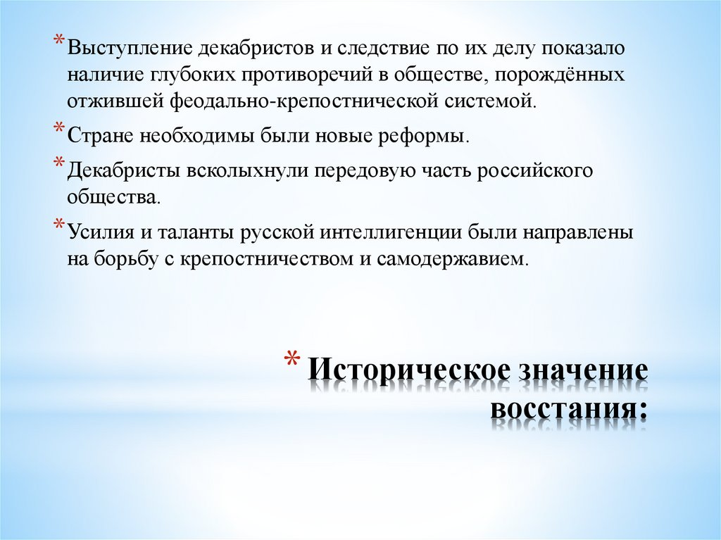 * Выступление декабристов и следствие по их делу показалоналичие глубоких противоречий в обществе, порождённых