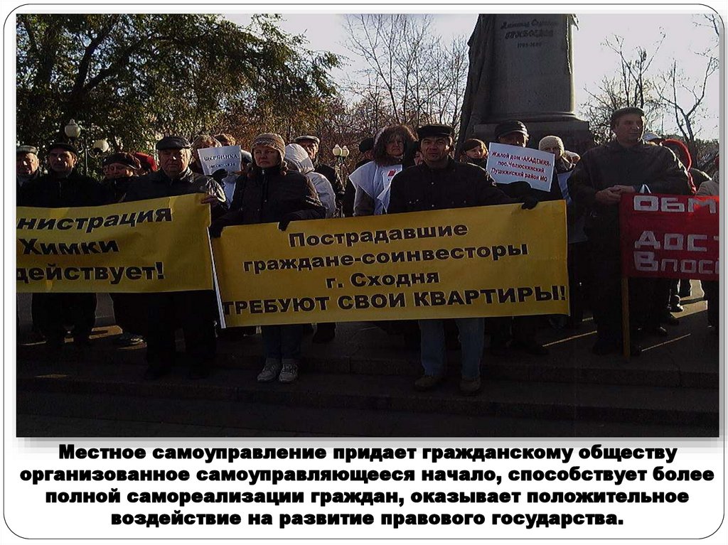 Местное самоуправление придает гражданскому обществуорганизованное самоуправляющееся начало, способствует более