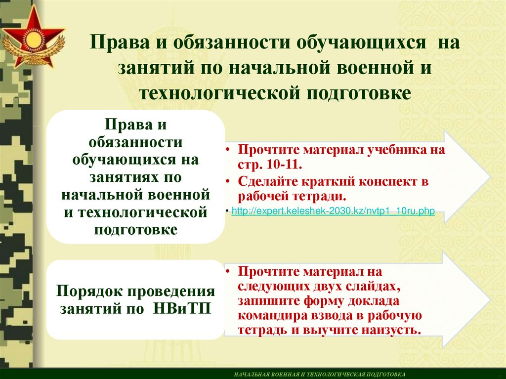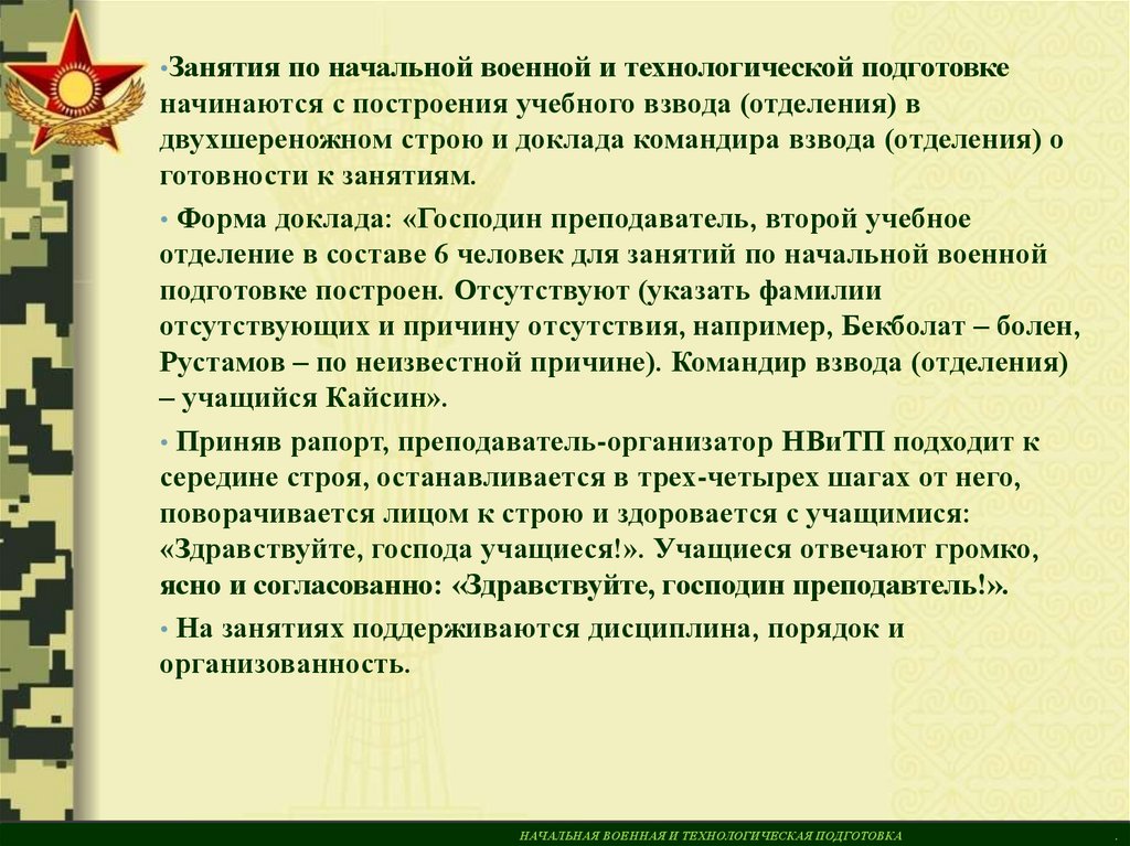 •Занятия по начальной военной и технологической подготовкеначинаются с построения учебного взвода (отделения) в