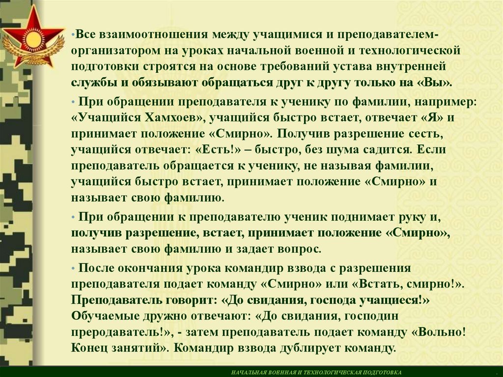 •Все взаимоотношения между учащимися и преподавателем-организатором на уроках начальной военной и технологической