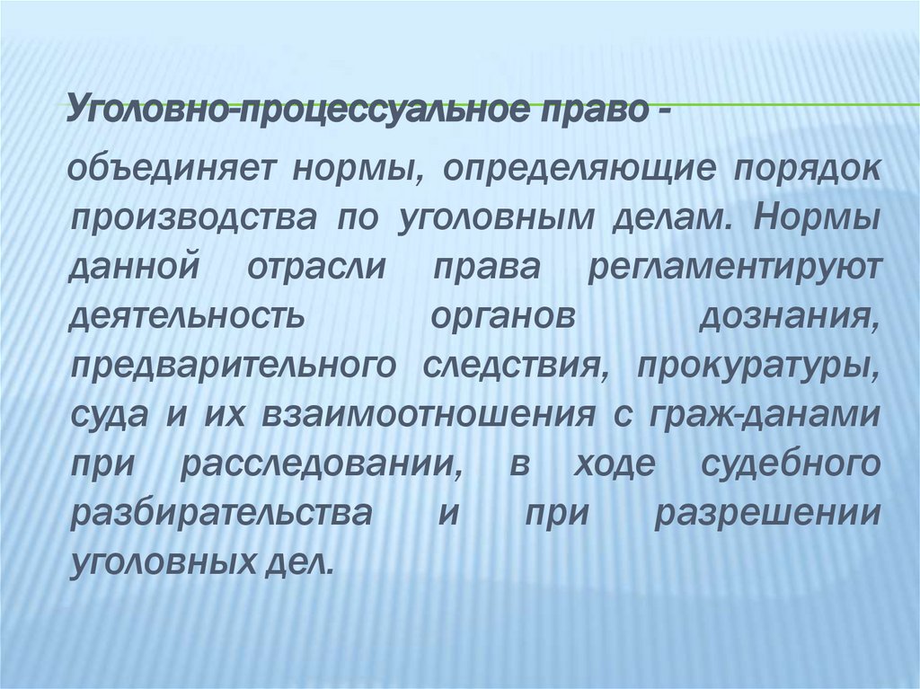 Уголовно-процессуальное право объединяет нормы, определяющие порядокпроизводства по уголовным делам. Нормы