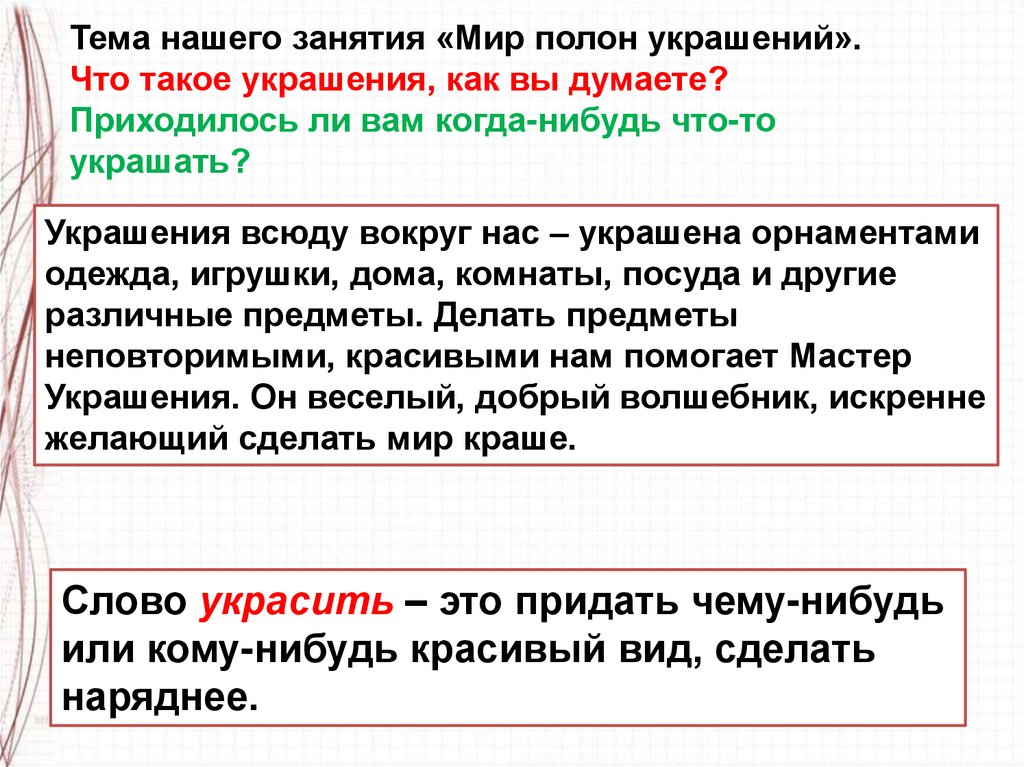 Тема нашего занятия «Мир полон украшений».Что такое украшения, как вы думаете?