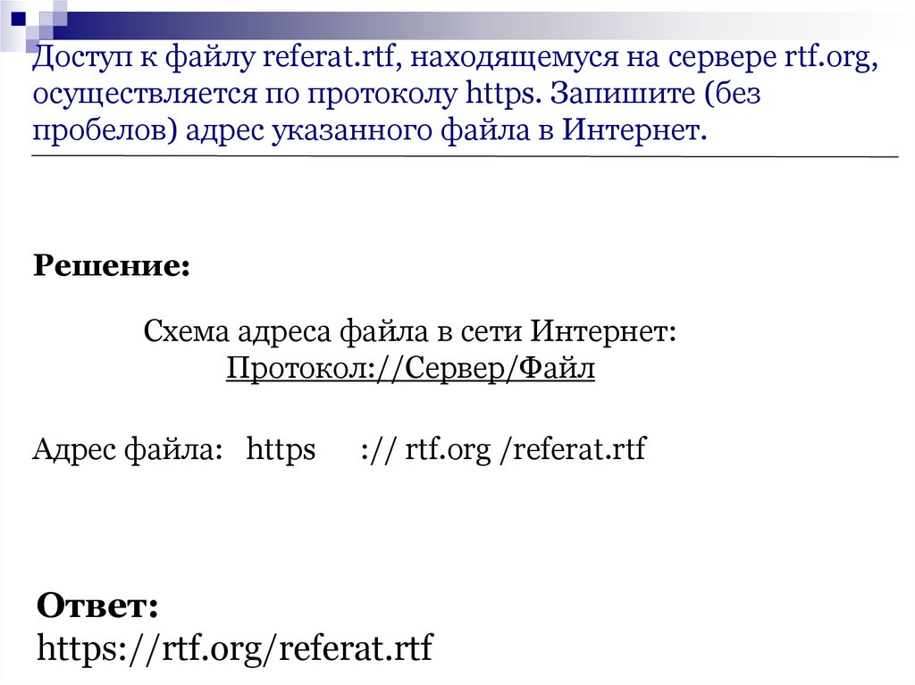 Доступ к файлу referat.rtf, находящемуся на сервере rtf.org,осуществляется по протоколу https. Запишите (без