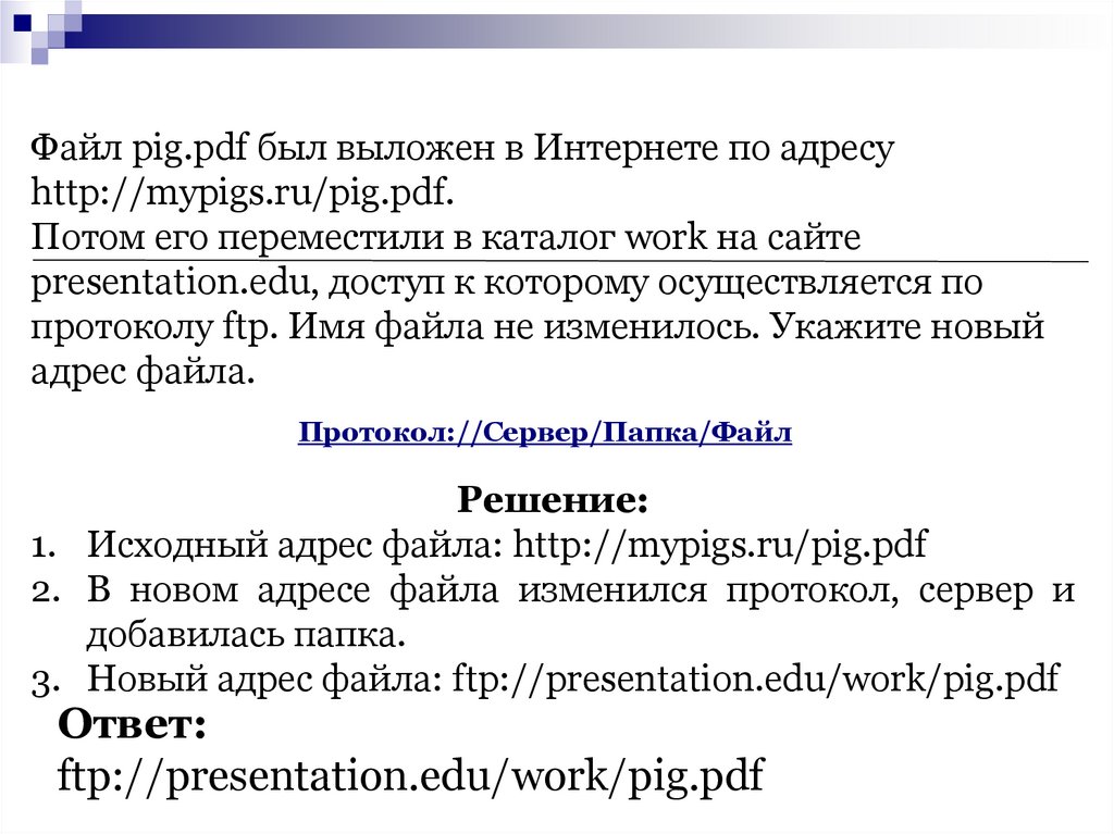 3. Новый адрес файла: ftp://presentation.edu/work/pig.pdf