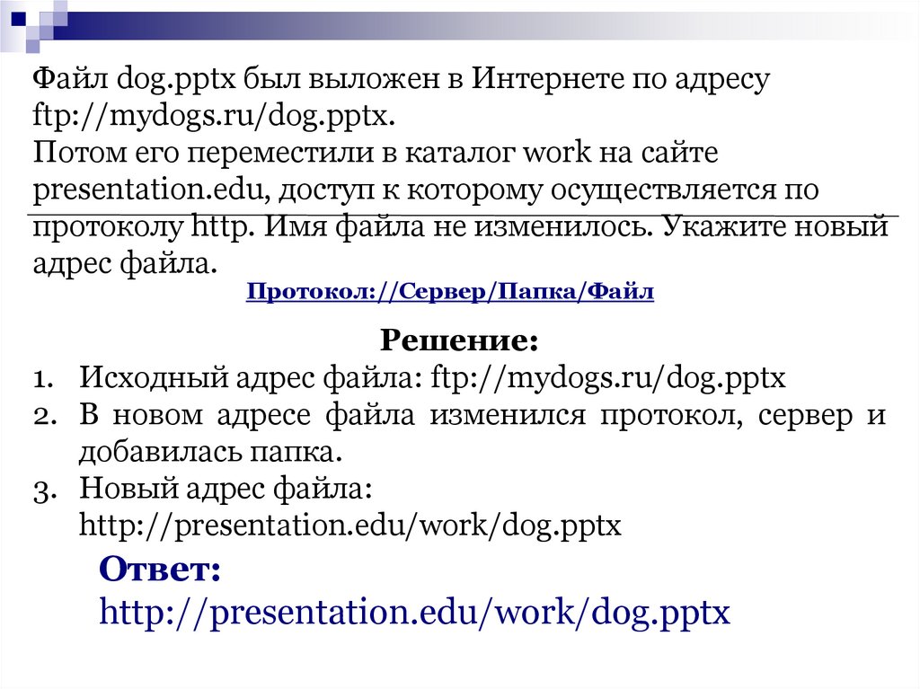 Файл dog.pptx был выложен в Интернете по адресуftp://mydogs.ru/dog.pptx.