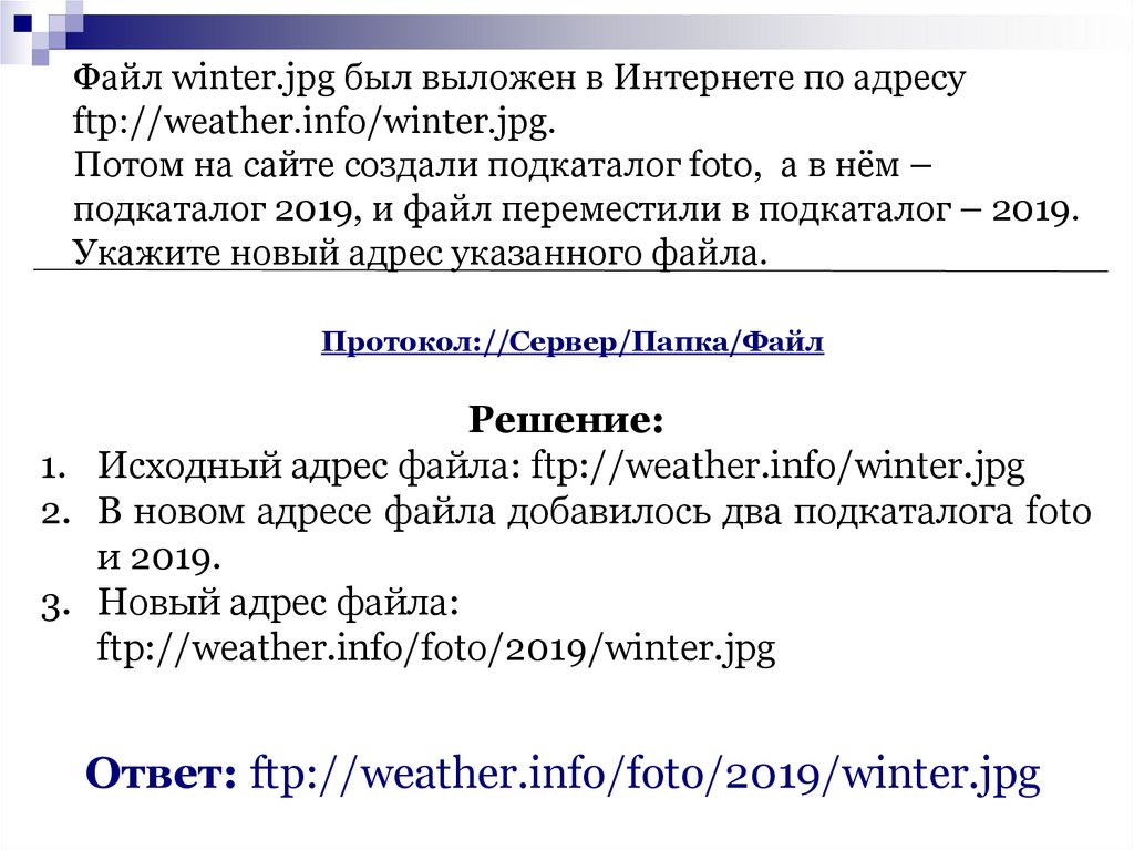 Файл winter.jpg был выложен в Интернете по адресуftp://weather.info/winter.jpg.