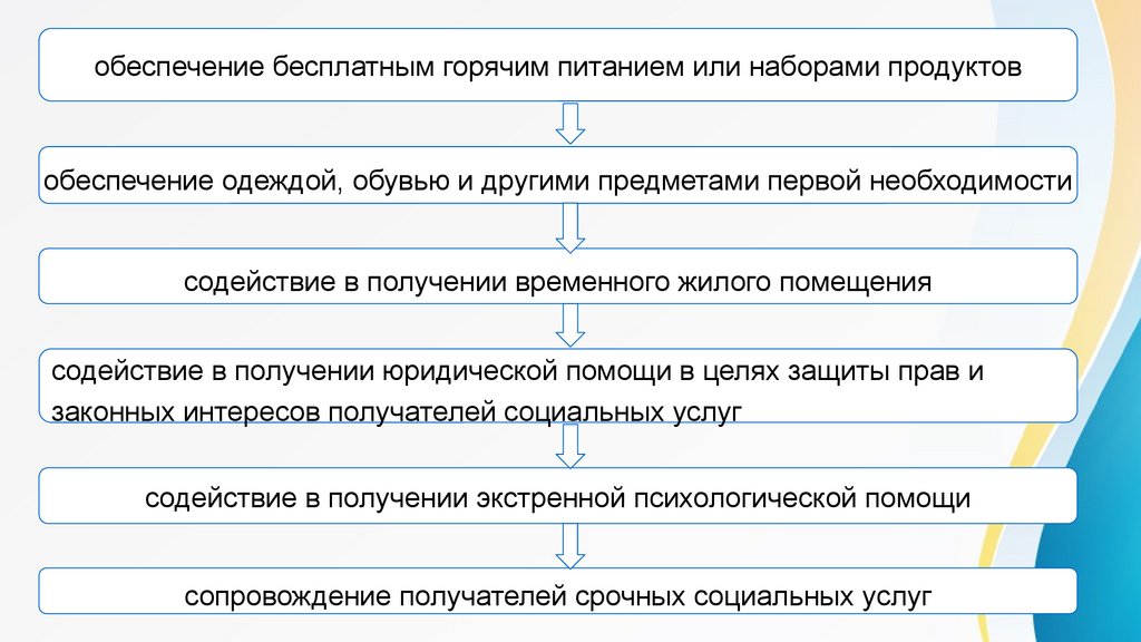 обеспечение бесплатным горячим питанием или наборами продуктовобеспечение одеждой, обувью и другими предметами первой необходимости