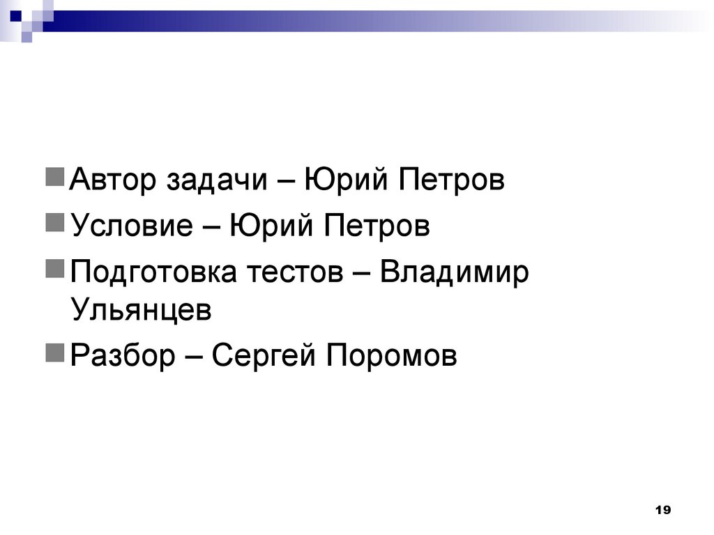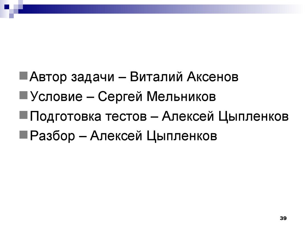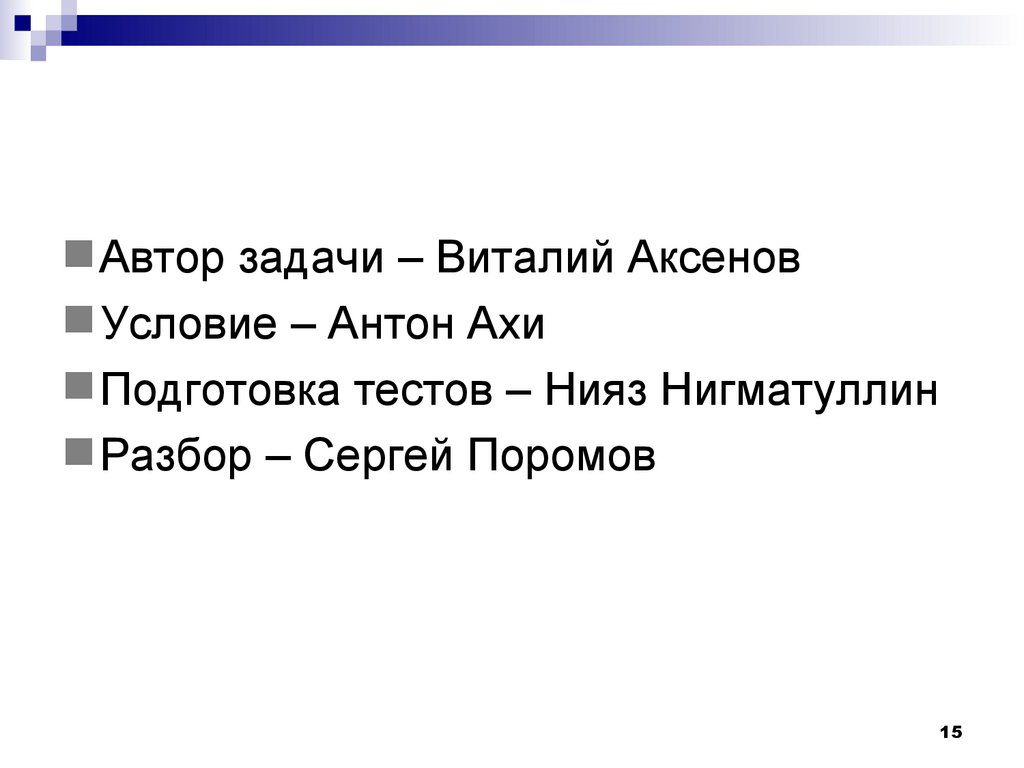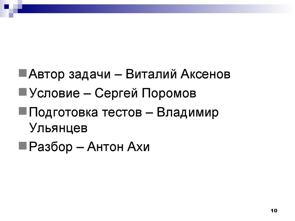 Автор задачи – Виталий АксеновУсловие – Сергей Поромов