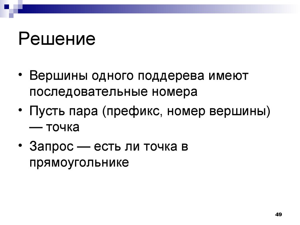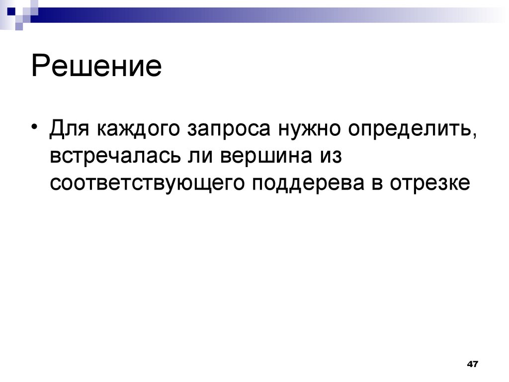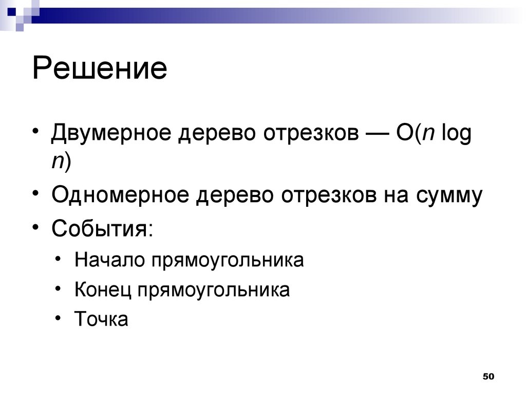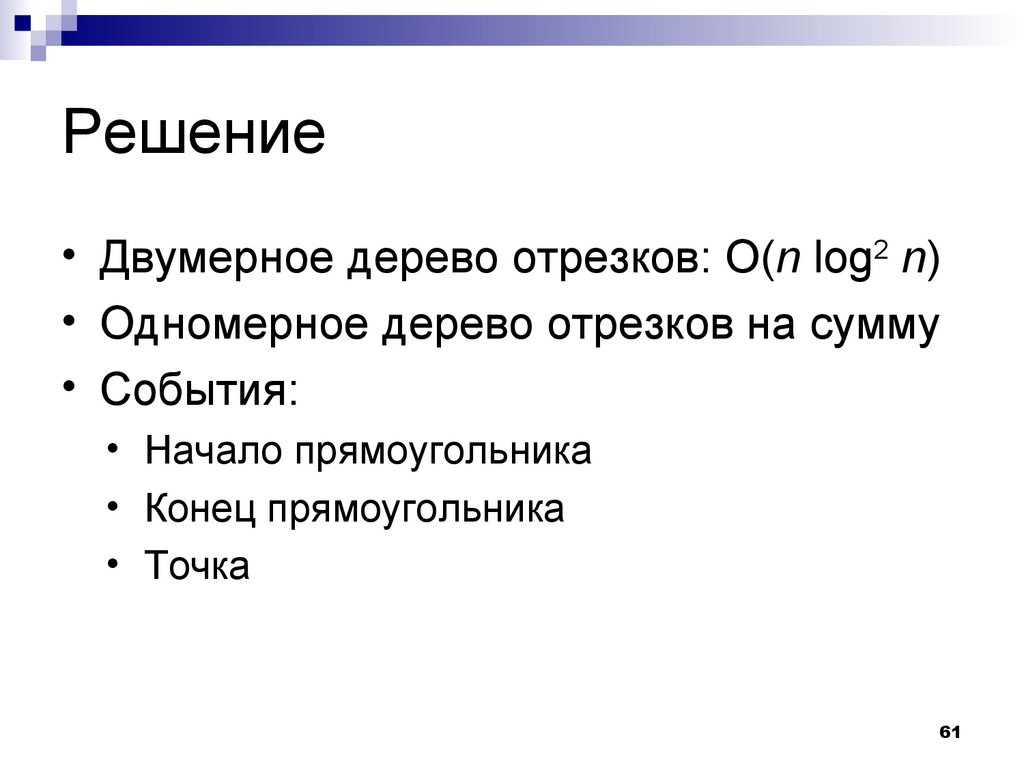 Решение• Двумерное дерево отрезков: O(n log2 n)